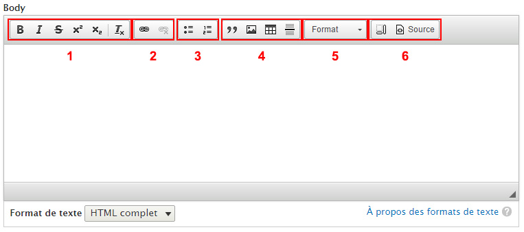 Ce champ est un champ WISIWIG (“What You See Is What You Get.”), c'est à dire qu'il permet des mises en page poussées totalement libres. Pour cela il est composé d'une multitude d'outil de mise en forme de textes ou d'intégration de contenus riches tels que des liens, photos ou encore des tableaux.