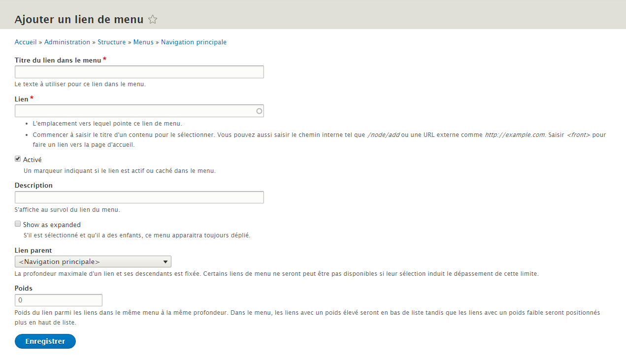 Cliquez sur le bouton “Ajouter un lien” dans la liste des liens de menus. Vous accédez au formulaire avec les champs suivants: