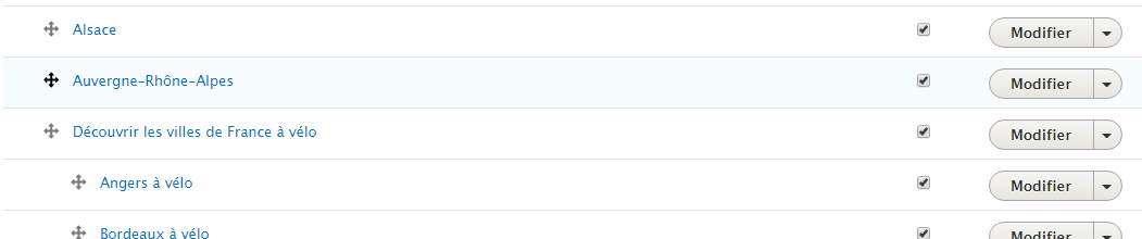 Depuis la liste des liens vous avez également la possibilité de modifier l'ordre des liens de menu (et donc les liens parents). Pour cela survolez la flèche à quatre branches, vous pouvez alors cliquer déposer pour ré-organiser les éléments.