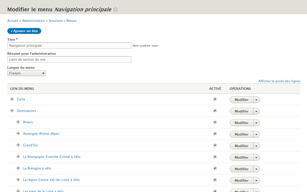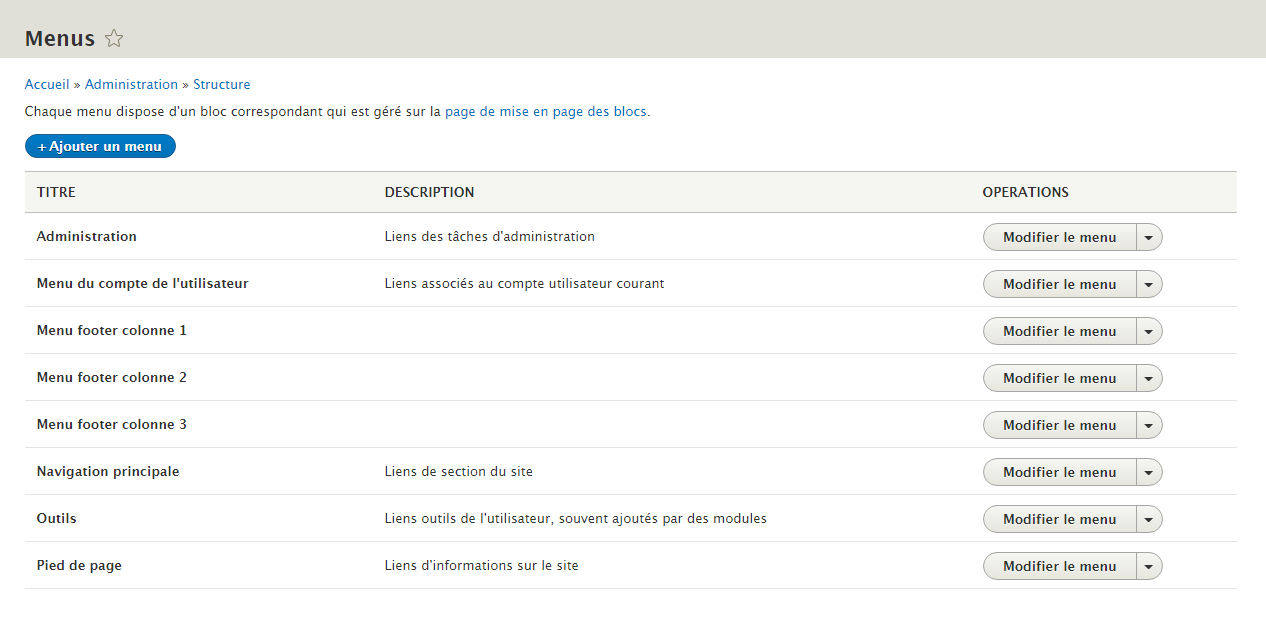 Vous pouvez accéder à la gestion des menus en vous rendant dans l'onglet “Structure” puis le lien “Menus”. La liste des menus actifs est alors présentée: