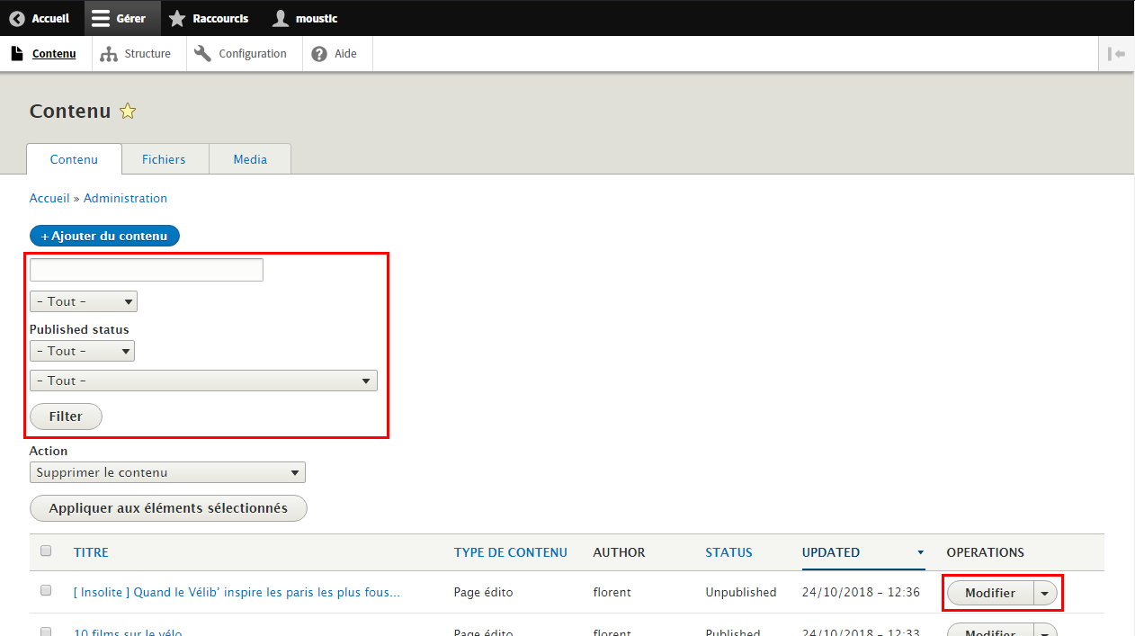 La première partie de l'écran se compose d'un moteur qui permet de filtrer les contenus par type, état de publication ou encore par langues: