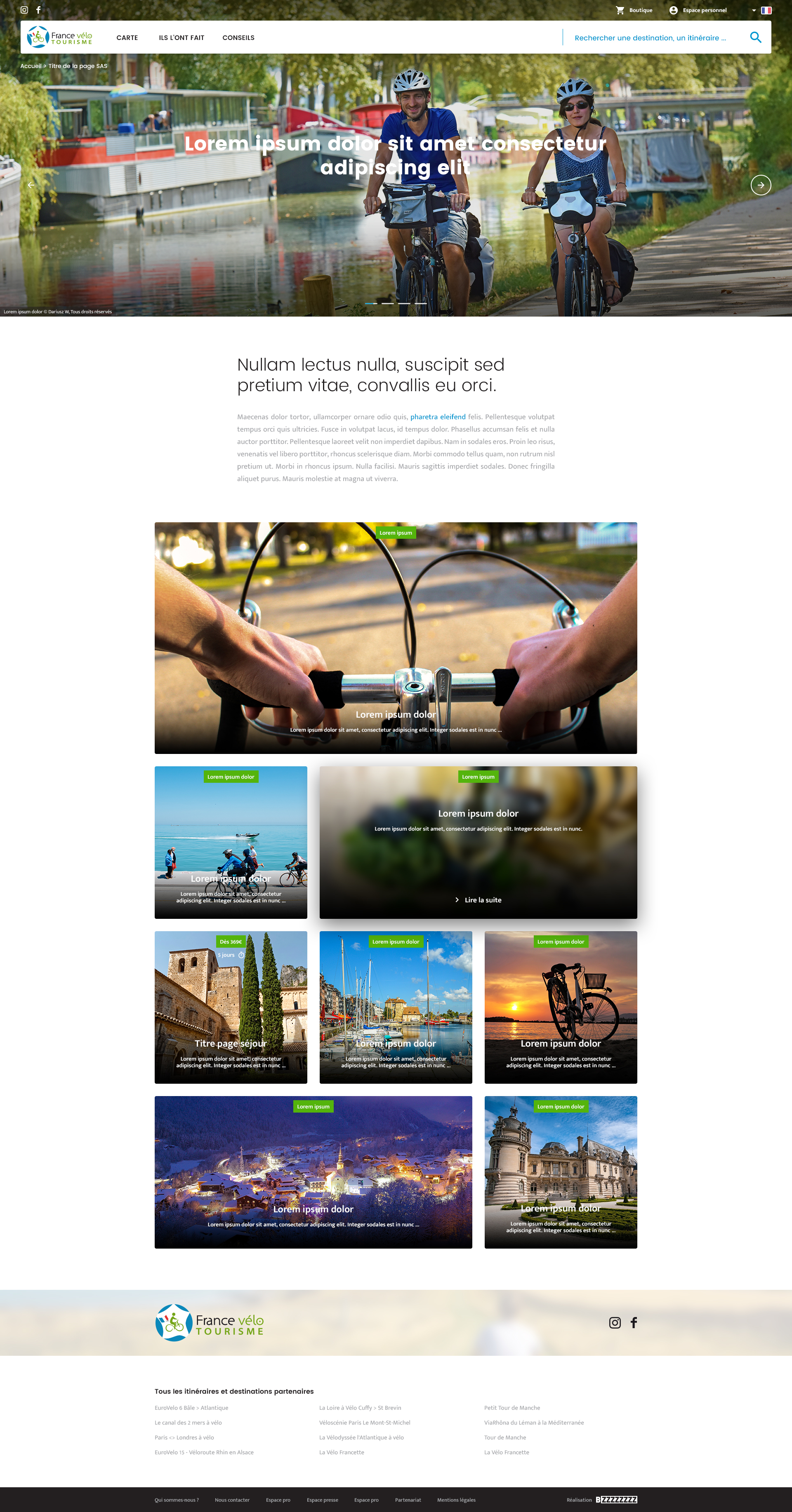 La page SAS est un modèle de page permettant de donner accès à d'autres pages de l'arborescence par le biais de multiples snippets affichés. Elle présente un slider full screen en partie haute permettant d'insérer aussi bien des photos ou des capsules vidéos, puis un corps de page composé d'un texte éditable via un champ WISIWIG, et enfin d'un mur de suggestions manuelles.
