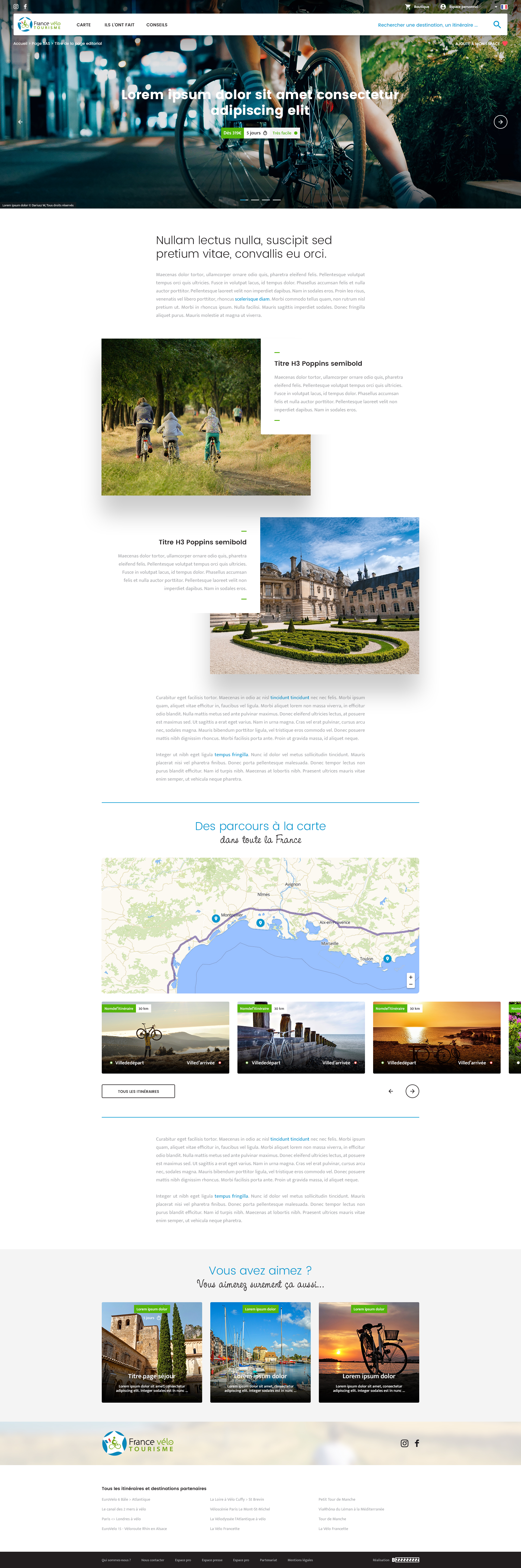 Le modèle de page séjour est similaire au modèle éditorial. Il permet d'afficher des contenus éditoriaux poussés, une carte si des contenus sont géolocalisés ou si des étapes ou itinéraires lui sont liées, du cross content… Il permet en plus de cela d'afficher un prix. Les séjours sont affichées dans une page listant tous les séjours.