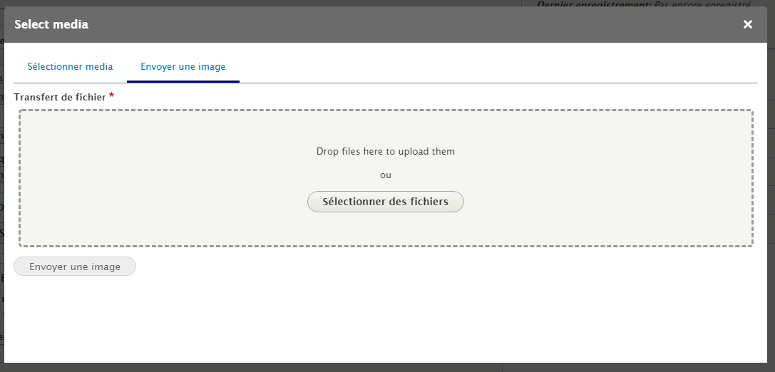 Si l'image que vous souhaitez afficher n'est pas encore chargée vous pouvez l'uploader sur le site en sélectionnant l'onglet “Envoyer une image” puis en cliquant sur le bouton “Sélectionner des fichiers”. L'explorateur de fichier de votre ordinateur s'ouvre, vous permettant d'aller chercher le média à intégrer au site depuis votre ordinateur. Vous pouvez envoyer plusieurs médias en un seul transfert. Pour valider le transfert appuyer sur le bouton “Envoyer une image”. Les images sont alors transférez à la bibliothèque de médias et disponible à la sélection dans l'onglet “Sélectionner un média”.