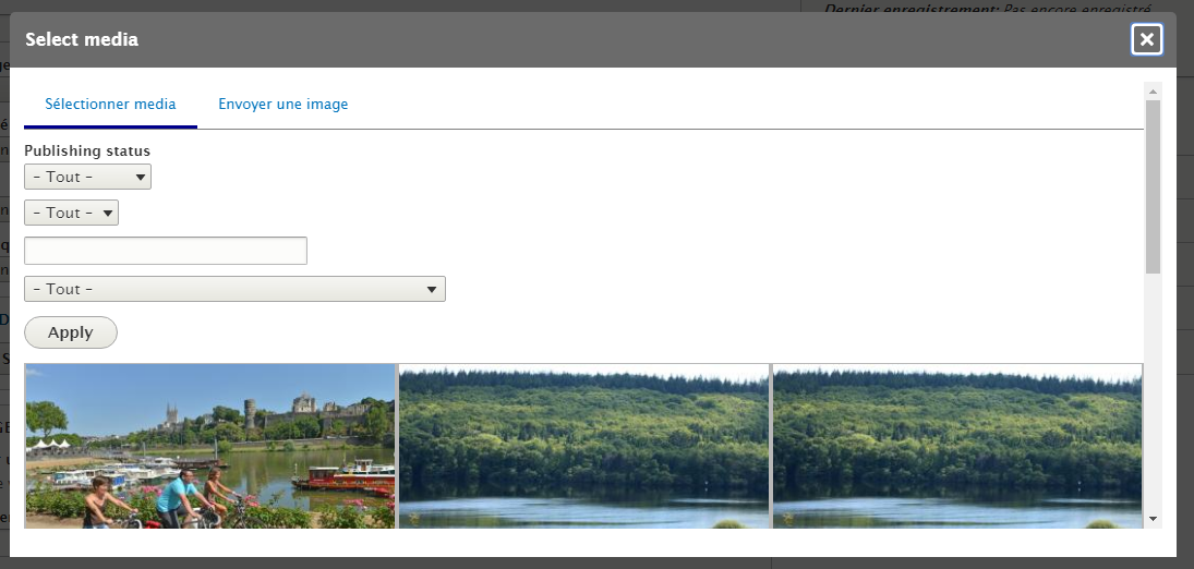 Une fenêtre présentant les images déjà chargées s'affiche. Par défaut l'onglet affiché est “Sélectionner média”. Vous pouvez filtrer les médias afin d’accélérer votre recherche.